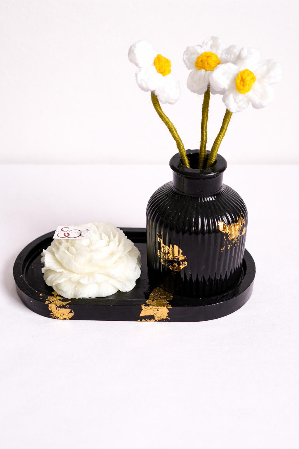 • Gold-Leaf Accents: Both the ribbed bud vase and the oval display tray are hand-finished with luxurious gold-leaf flakes, making every piece uniquely yours.