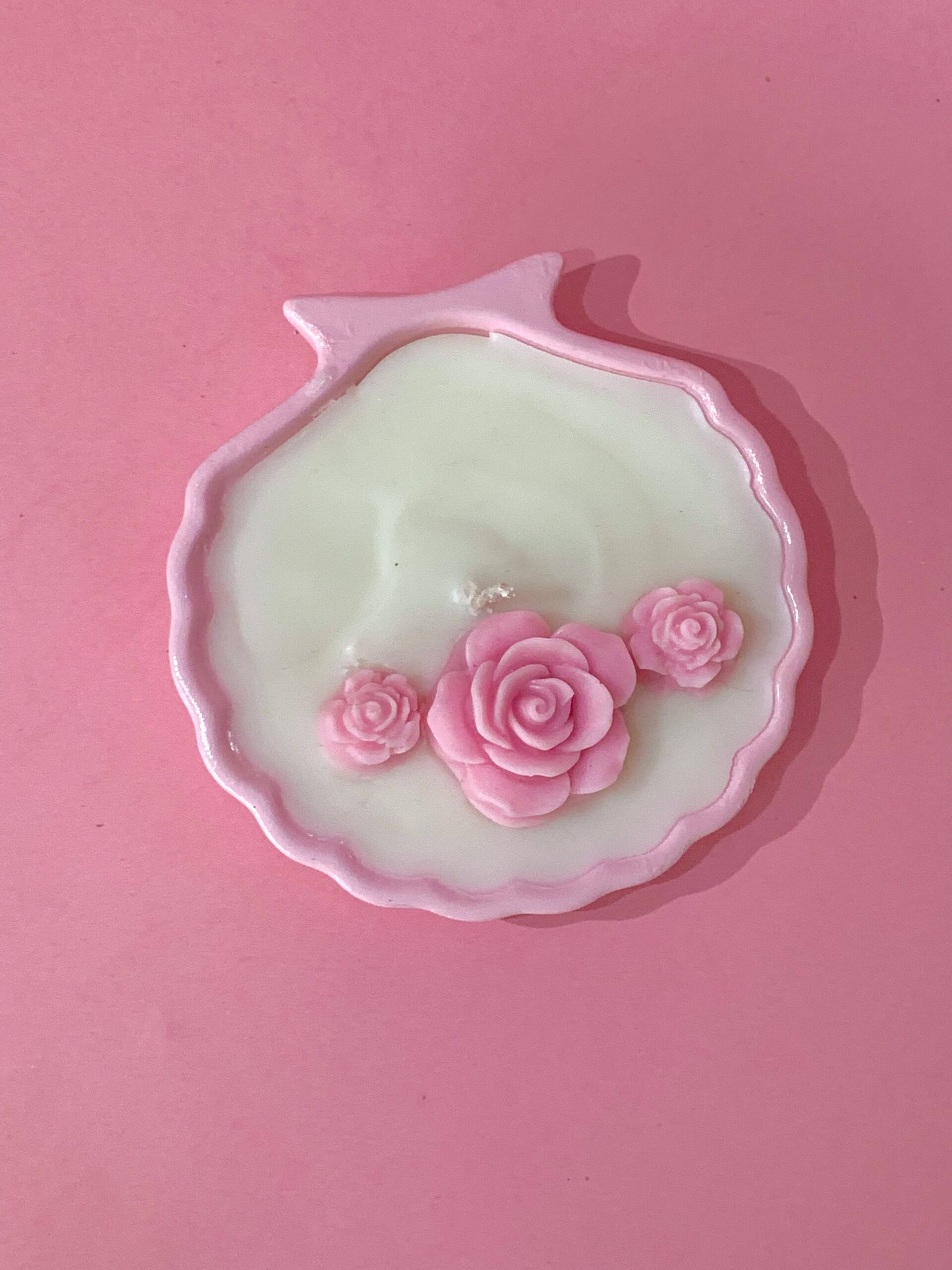 Bring a touch of the ocean and the garden into your home with this exquisite seashell candle. Nestled within a delicate, scalloped pink shell, this creamy white wax candle features three intricately detailed pink rose embeds