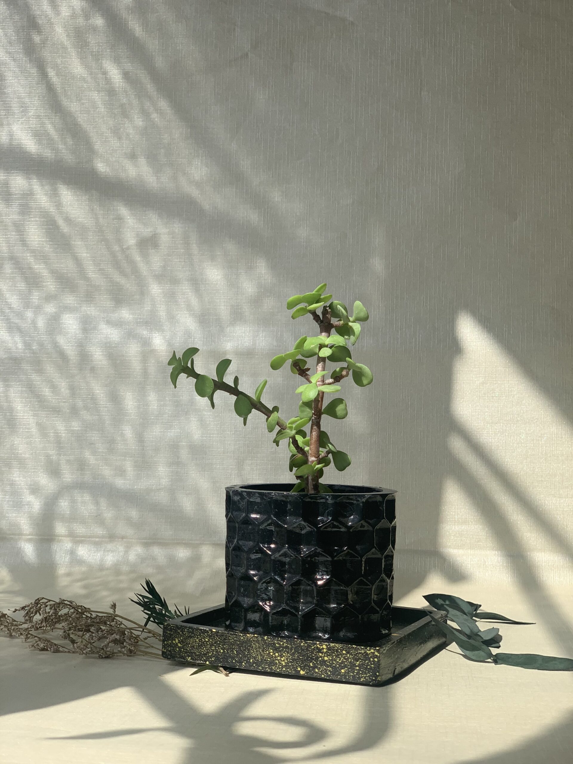 Elevate your desk or windowsill with the sculptural beauty of our Elephant Bush. Nestled in a concrete pot featuring a geometric honeycomb texture, this resilient succulent brings a touch of the wild into a refined setting. Paired with a matching speckled tray, it’s a ready-to-display piece of living art